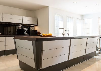 La cocina está equipada con electrodomésticos de primera calidad, que incluyen dos hornos Smeg, un refrigerador / congelador de estilo americano, un grifo de agua hirviendo “Quooker” y cajones de apertura automática operados eléctricamente. Una isla central, iluminación led y puertas panorámicas de vidrio completan este elegante espacio, que conecta perfectamente el interior con la terraza orientada al oeste, exuberantes jardines y una piscina infinita.